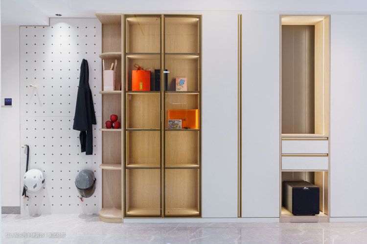玄关沿着6715mm长度墙体做了一整排柜子,左侧留了圆弧隔板柜,平时可以放置一些小物件及摆件。玻璃双开门展示柜,加入灯光设计,让柜子藏品更有活力,便于屋主的收藏。 Tips:洞洞板,对于小户型来说,收纳一直都是非常重要的事情,洞洞板不止是收纳神器,用好了颜值还高,真的非常有用!
