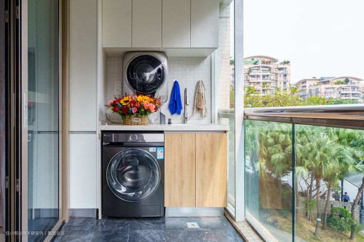 阳台没有采用落地玻璃封边,推拉玻璃门隔断,彼此之间区分出了生活面积。作为晾晒阳台,洗衣机+洗手池是必不可少的。利用墙体一侧做的嵌入式洗衣机加洗手台组合,搭配吊挂式白色的柜体,更显一份洁净。