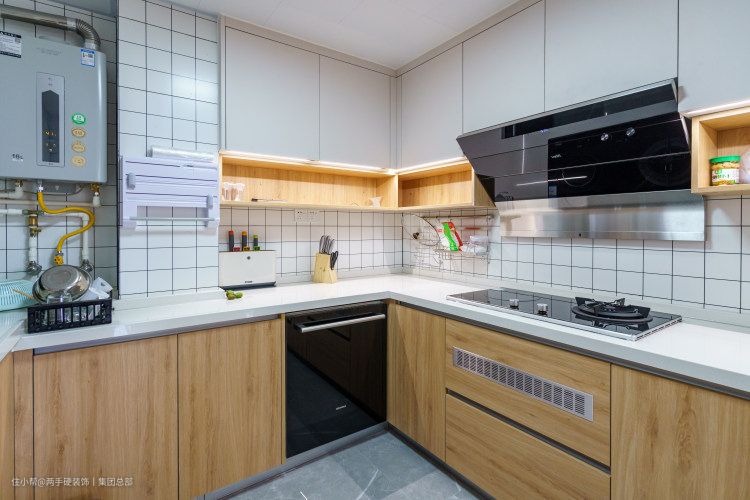 厨房打造U型橱柜,动线流畅,做了高低台面,很大程度上为烹饪提供了舒适度。厨房整体以小方格砖为铺设,原木色橱柜、石英石台面,营造干净整洁的烹饪环境.