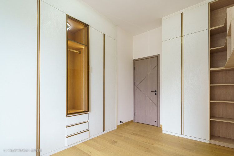 次卧跟主卧一样,利用墙面定制整排到顶衣柜,靠卧室一侧可以放上当季常用的衣物,靠内则收纳不常用以及床品套间等物品。柜门预留了暗槽的造型方便开关门,效果同样简洁舒适。