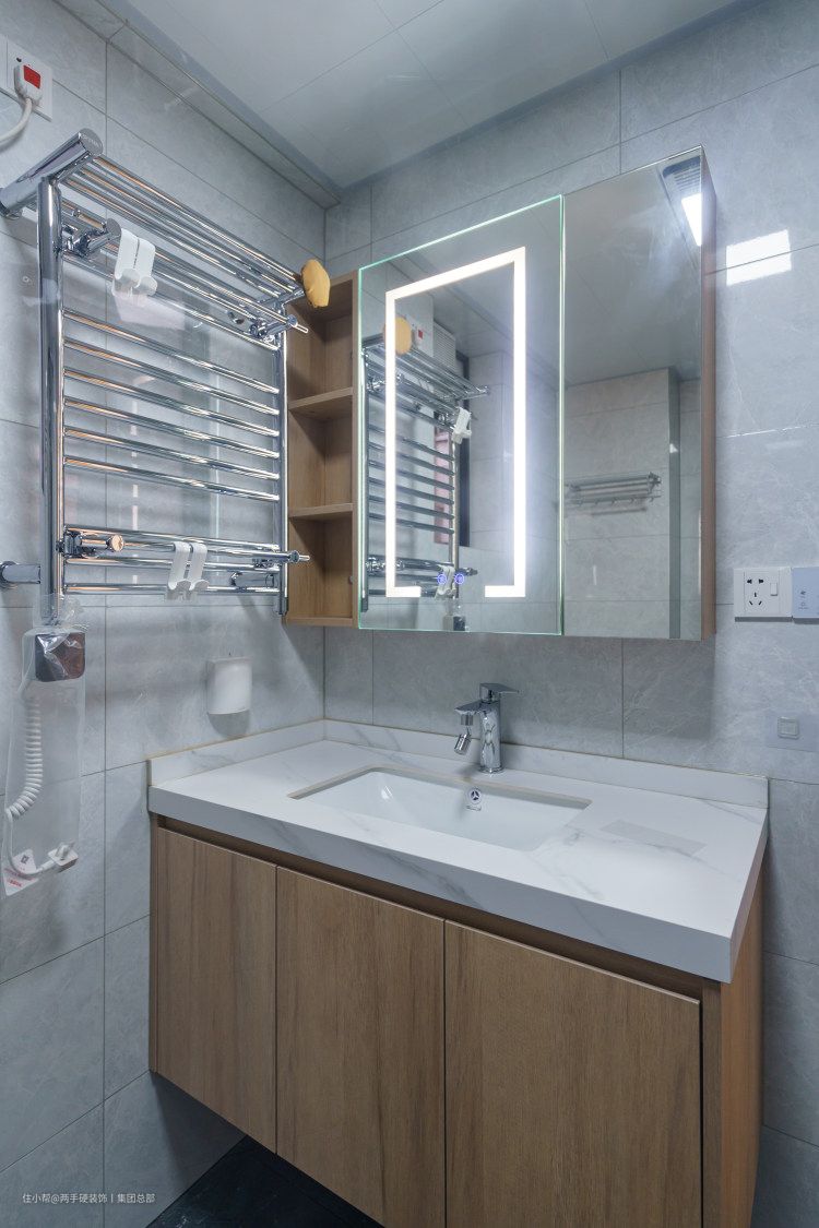 主卫墙面采用亚光白色大砖铺贴。定制了LED一体化镜面和悬浮柜体。内嵌收纳功能,一侧做的毛巾置物架,完全满主卫的日常需求。