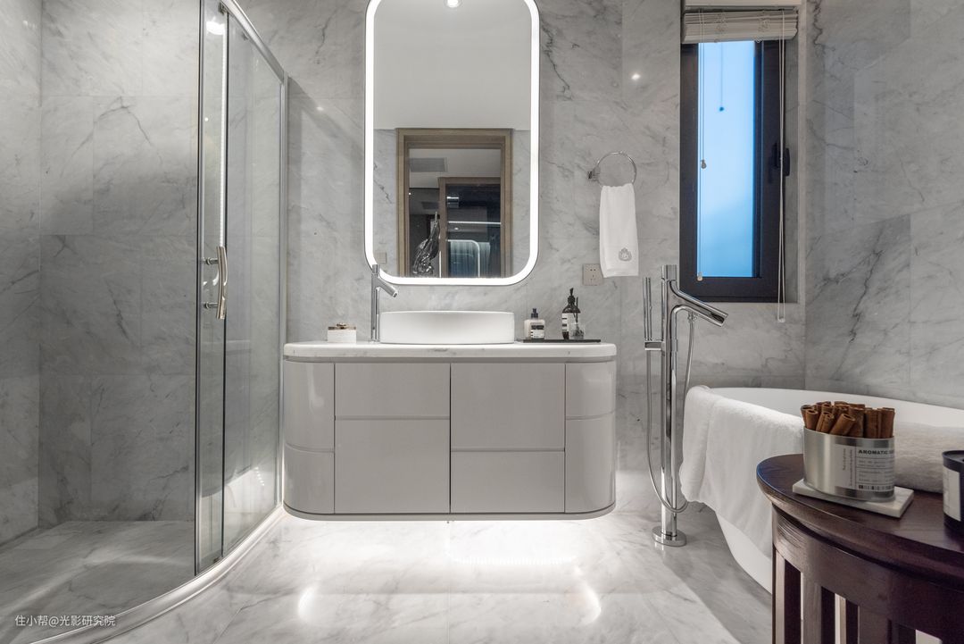 这种光线有助于减少橱柜等家具对小浴室的房间收缩效应。隐藏在镜面后的灯光让墙壁感觉更远,从而使空间看起来更大一些。