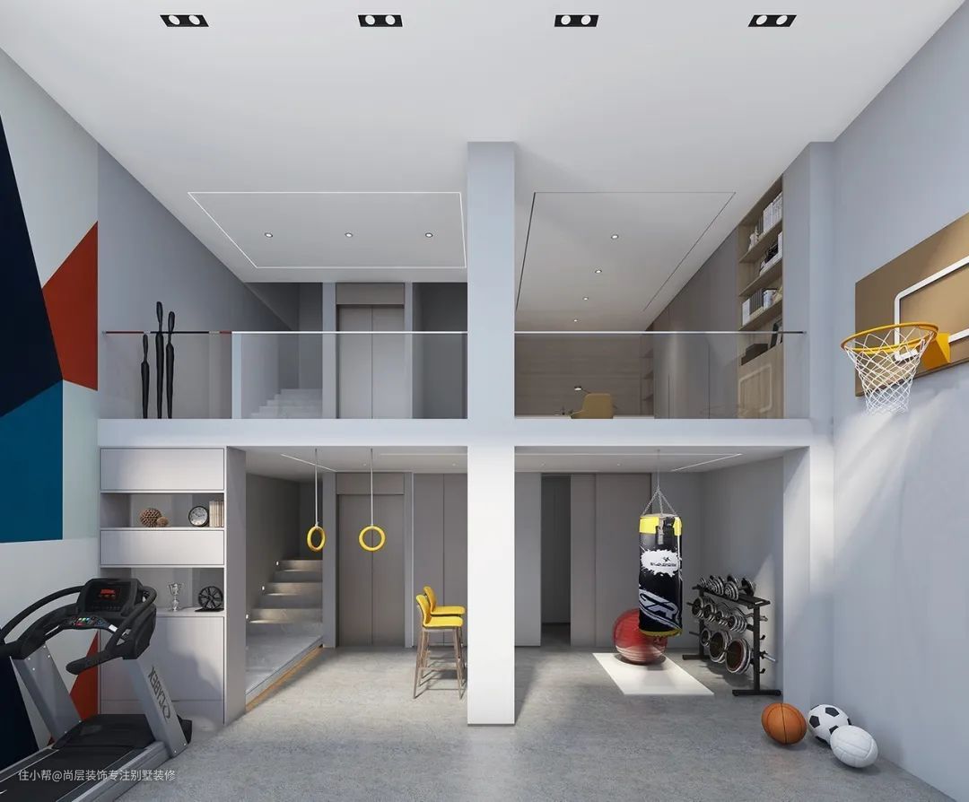 该地下室主要是做了一些功能区域,负一层为小孩的兴趣培养为主,负二层为家庭运动区。墙面刷浅灰色乳胶漆搭配几何形背景墙,让整个空间看起来具有现代运动感。