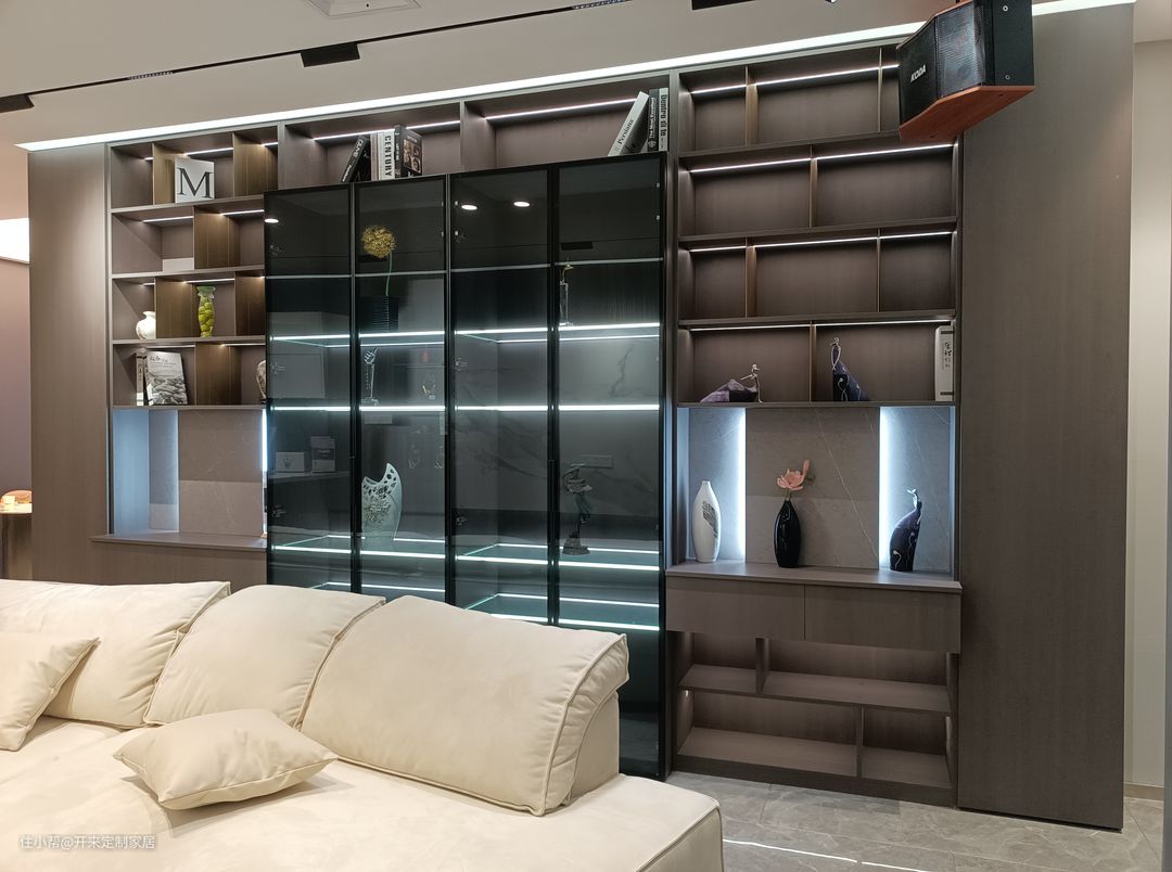 居中黑色窄边灰玻璃柜作为视觉中心,通透又隐秘的玻璃质感,结合顶层开架添装饰与收纳空间,带来优雅与大方的生活气息。
