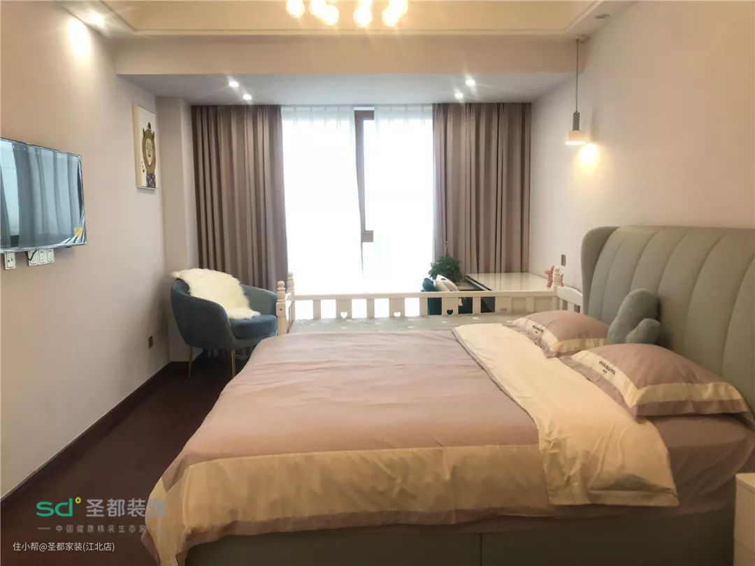 你说宁可自己辛苦点,要从小给宝宝安全感,所以咱们的主卧里一定要有张婴儿床的。整个卧室豆沙系的颜色,是我补给你的,迟到的浪漫。