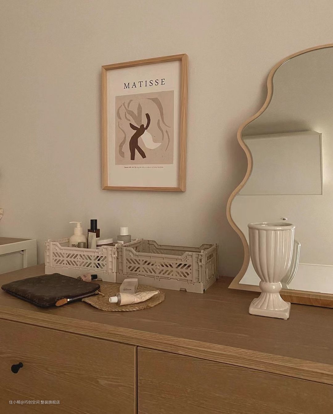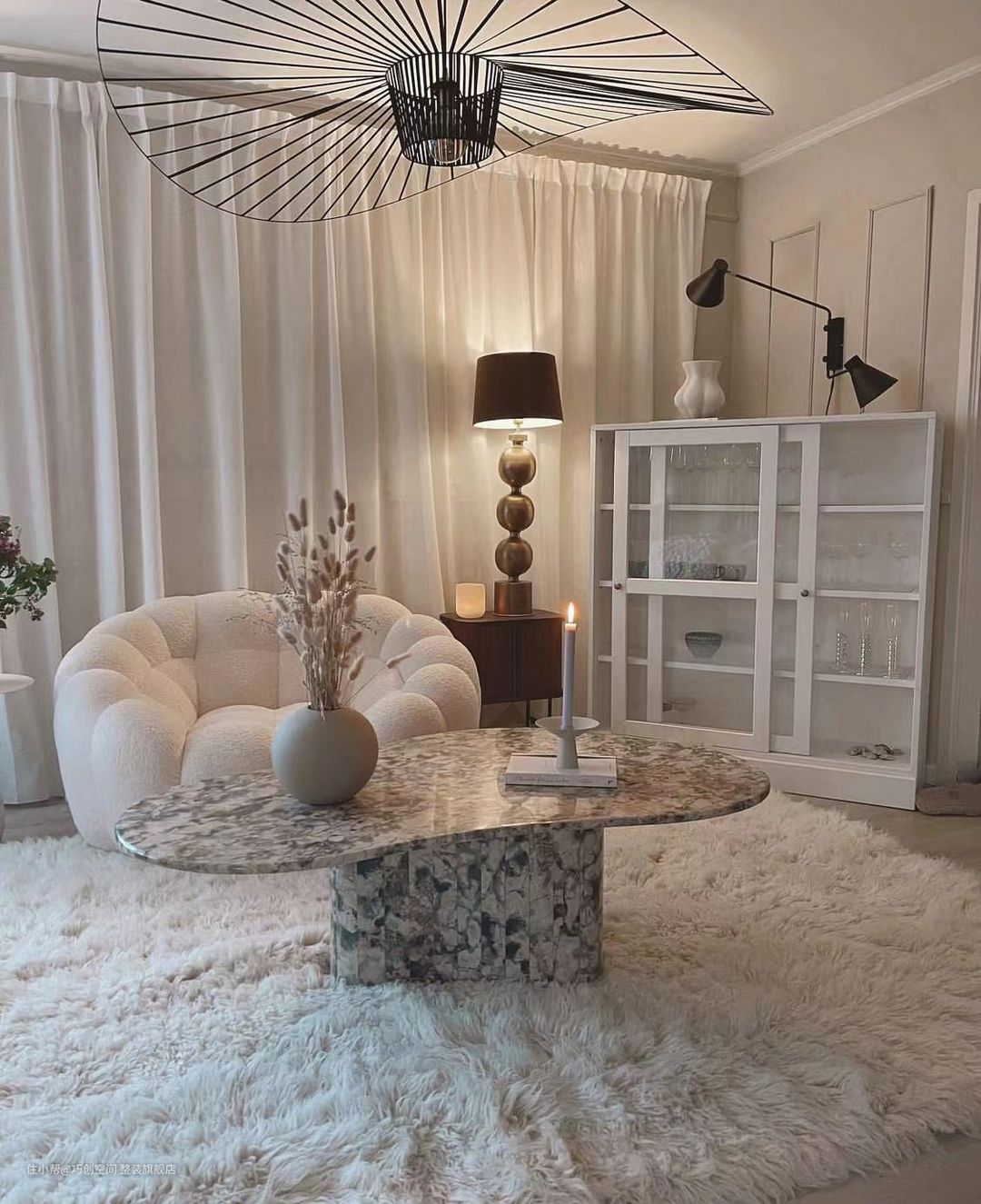 材质选择:倾向选择羊羔绒、珊瑚绒、灯芯绒,还有亚麻、亚克力、原木、藤编、皮革等等,这些有肌理感又带有温暖气息的材质,与整个空间的氛围搭配起来更加和谐。