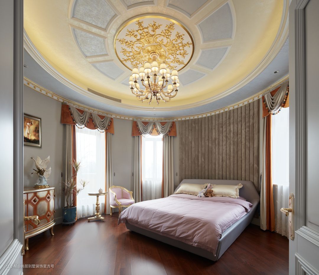 圆形的设计也非常容易产生奢华、高贵的感觉,用于宫廷风的房间,能够迅速营造皇室的奢华气质,颇受成功人士欢迎。