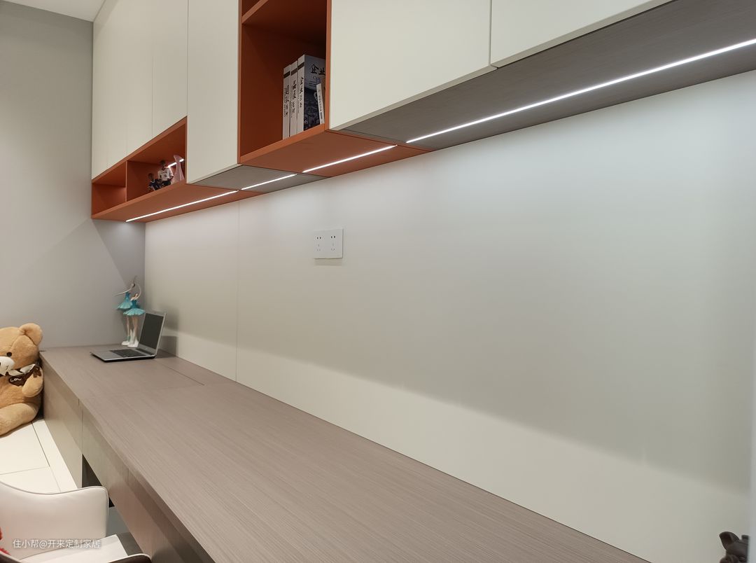 书柜吊柜设计,封闭设计中结合纵+横排列的错色开架打造出随手存放的开放区,收纳同时也很装饰,吊柜下方增设灯带,照明兼备视觉美感。