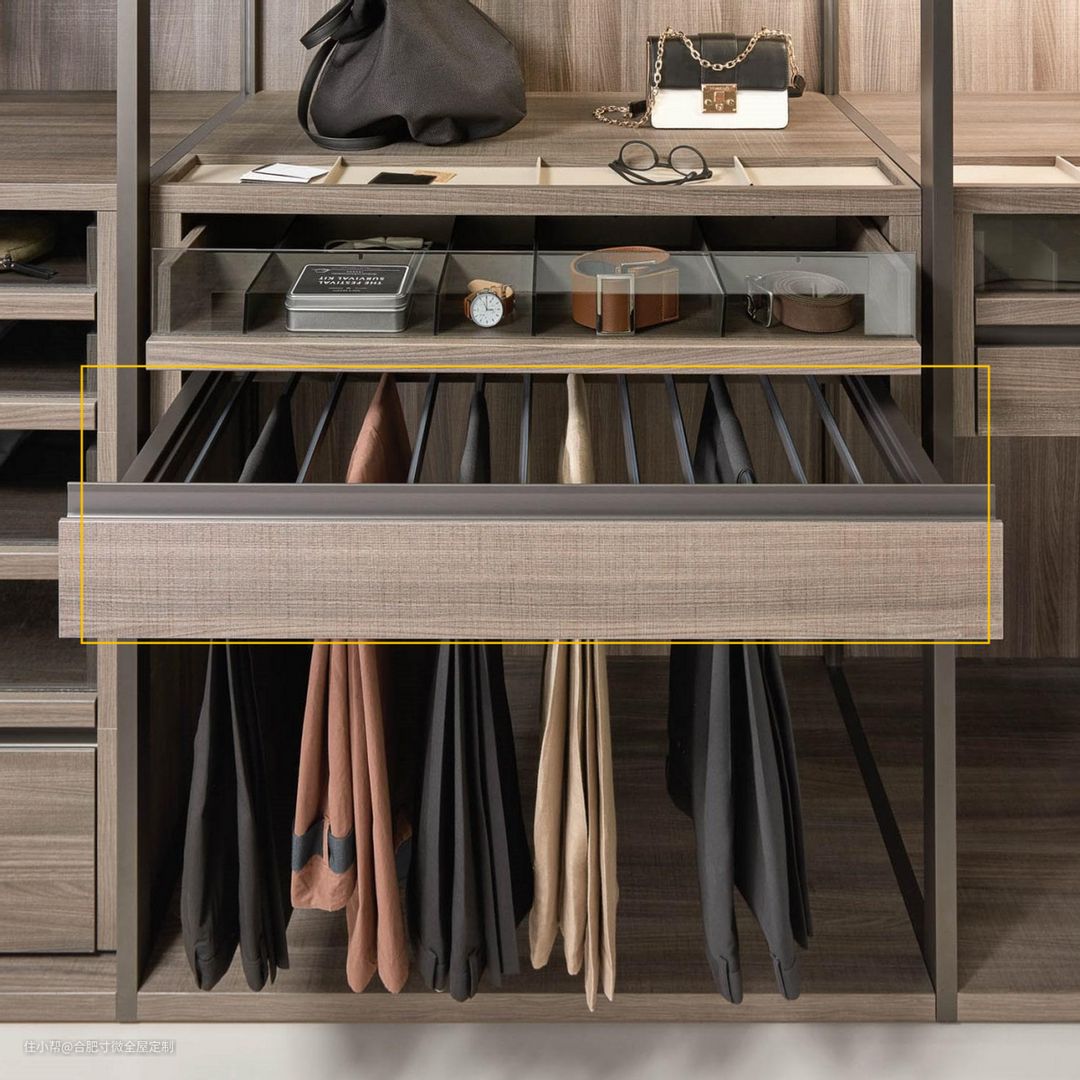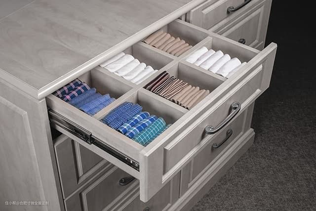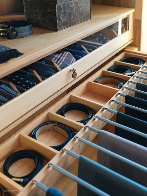 抽屉也不要跟以前一样直接一个大白格,提前做好分格设计,分开放私人物品,干净卫生,或者用来放男士领带、腰带收纳。