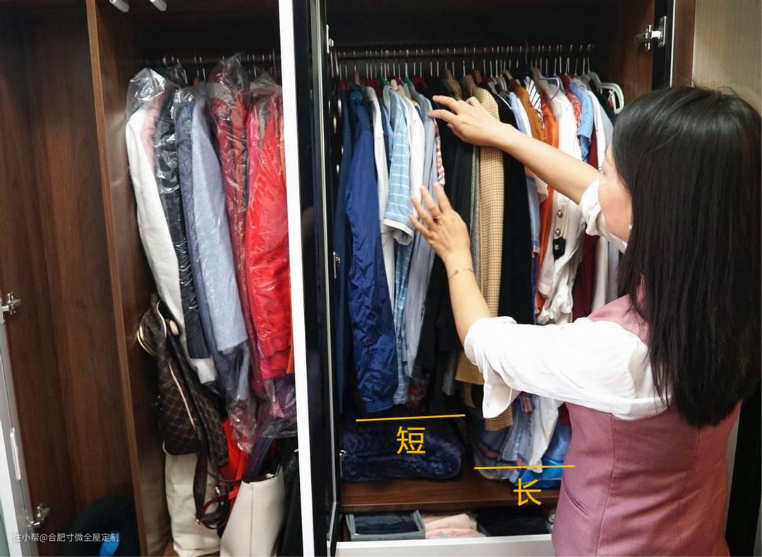 像我家,虽然有把衣服挂起来拿方便的意识,但没有按长短分区挂这个概念,长的短的挂一起,如果衣服多的话,长衣服很容易把短衣服给遮住,不仅空间杂乱还给找衣服增加的难度。