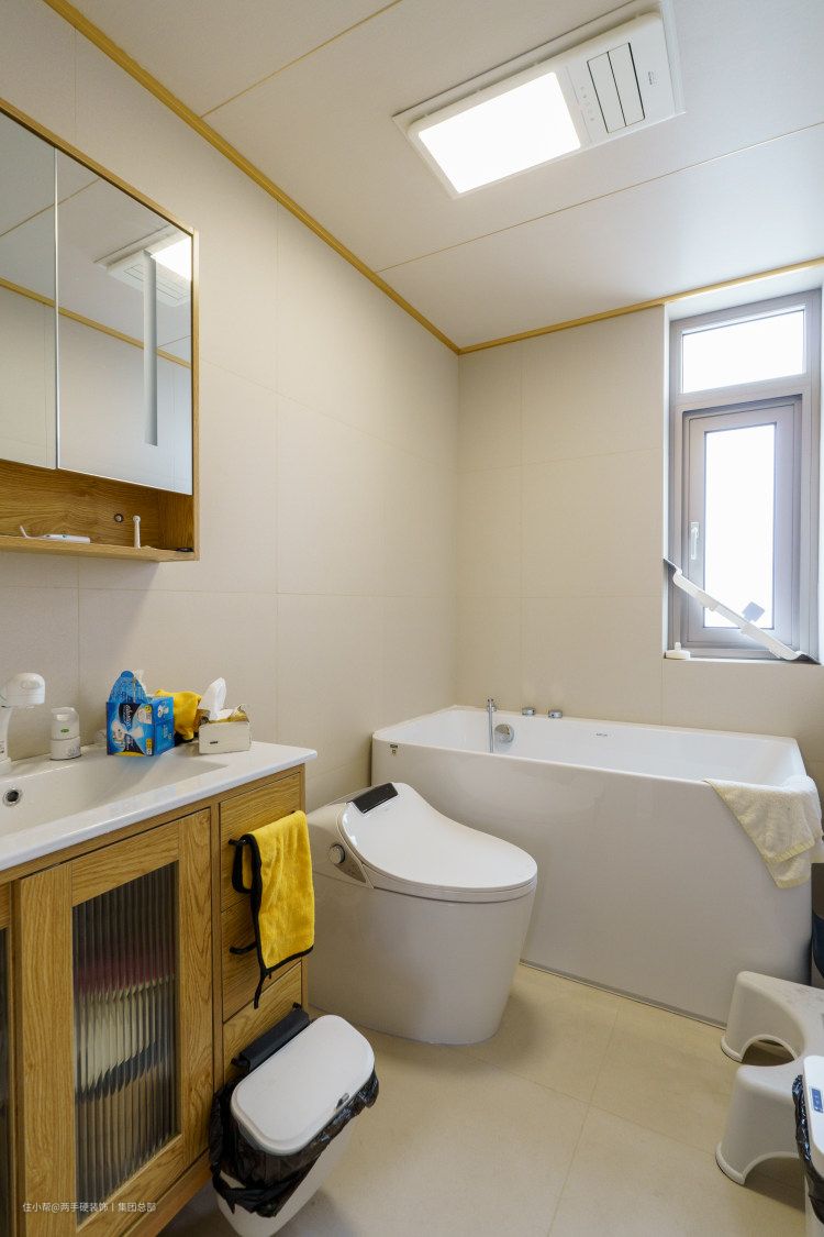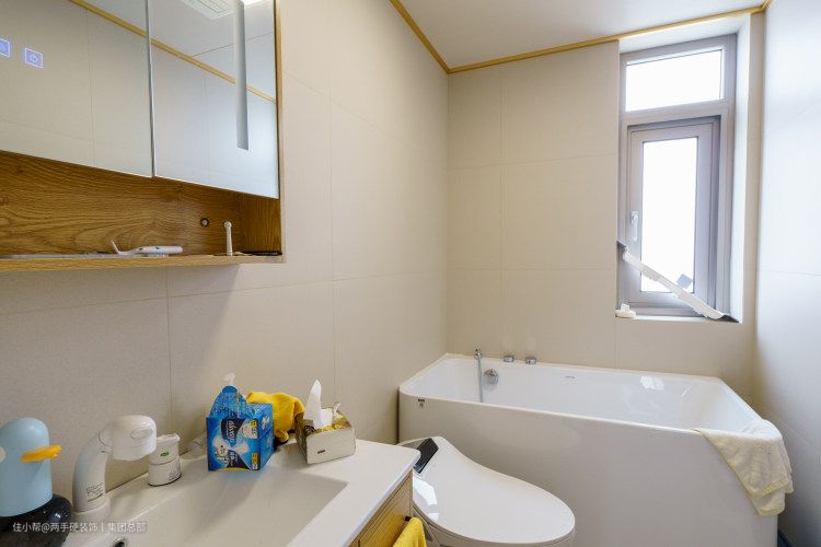 主卫仍旧保留了原来浴缸的位置并进行了更换。白天高强度工作身心疲惫,业主希望回到家能够泡个澡冲刷一天的疲惫,晚上也好入睡,在浴室柜的下方安置了垃圾桶,避免洒湿和被踢来踢去,干脆将其悬挂在柜子上,方便实用还好打扫。