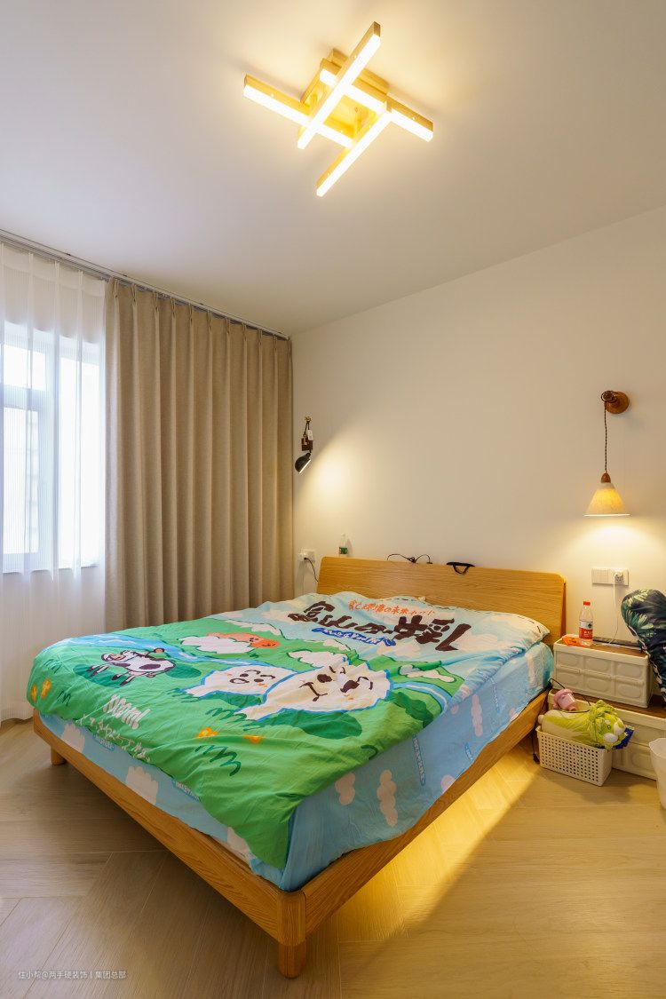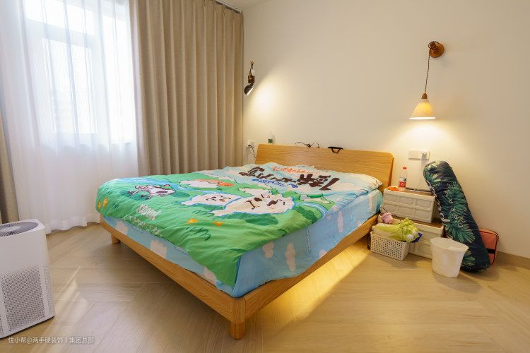 床前选择了两种不同的灯,现在看来倒是有种不对称的独特艺术感。卧室的地板没有选择客厅的800*800通铺大方砖,而是选择了原木色地板砖,与床板色系更搭,与暖色调的灯光相衬显得卧室格外温馨。