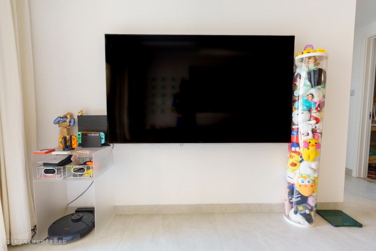 因为待在客厅的时间不长,需求不大,所以背景墙没有做过多的装饰。因为家里娃娃太多也占地便想到了用透明收纳桶收集起来,摆在客厅还成为漂亮吸晴的装饰呢~