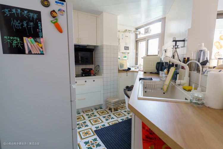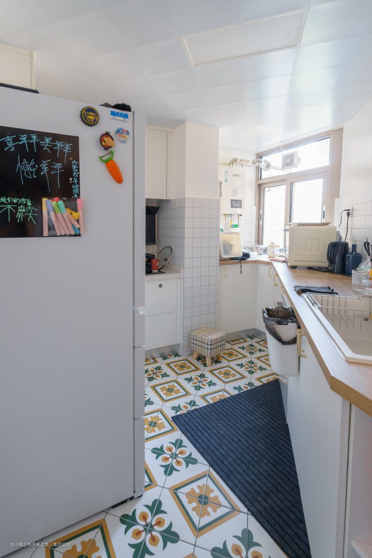冰箱放在厨房方便下厨时拿取肉菜。侧面还贴了小黑板,可爱的女主人每天都会将菜单列出来,在这个厨房里感受到了浓浓的生活烟火气息。因为厨房地面难免会碰到水,所以选择了防滑的材质,明亮的橘色调碎花小方砖也不突兀,与厨房整体的白色系搭配起来很清新,一改旧厨房的油腻沉闷感。