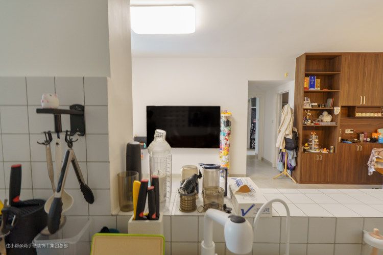 半开放厨房设计可以增加一些我们平时厨房跟客餐厅活动的互动,增加空间感跟视觉感。每一样厨具用品悬挂的、倒立的、平铺的都被女主人一一归类放置好,整个台面显得干净整洁。