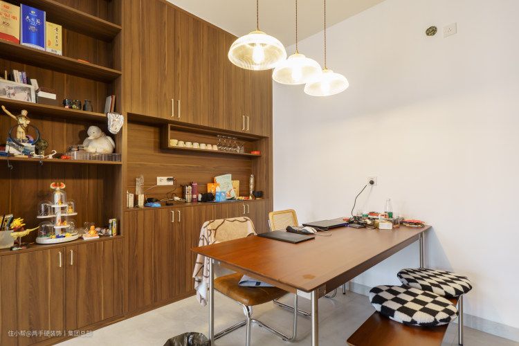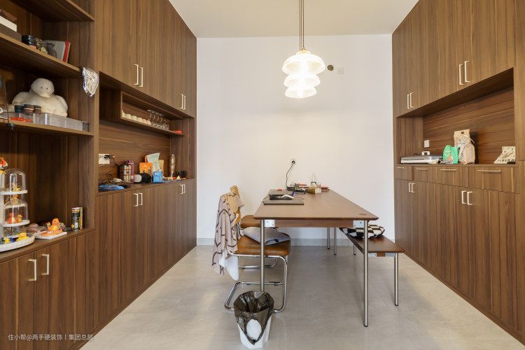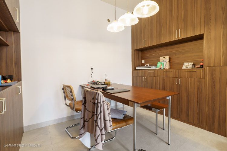 餐桌有时候也会充当工作桌,业主有时候会在这办公。两边的椅子分别选择了靠椅和长条椅子,看上去没有丝毫违和感。同色系的搭配引起极度舒适。