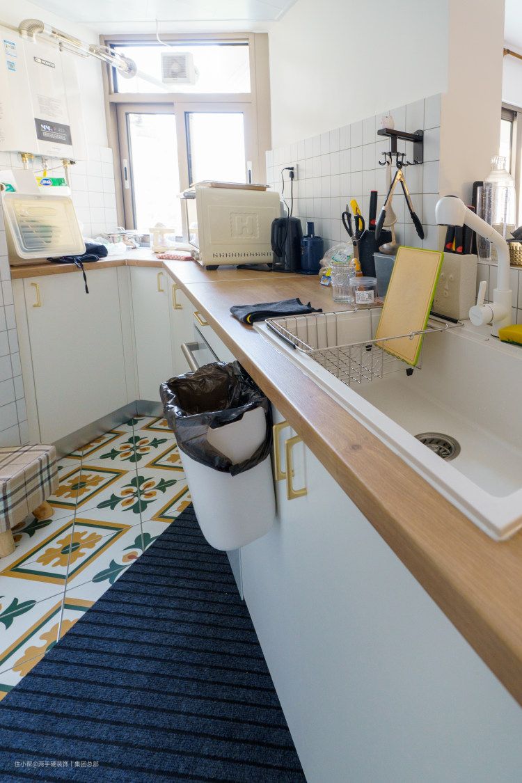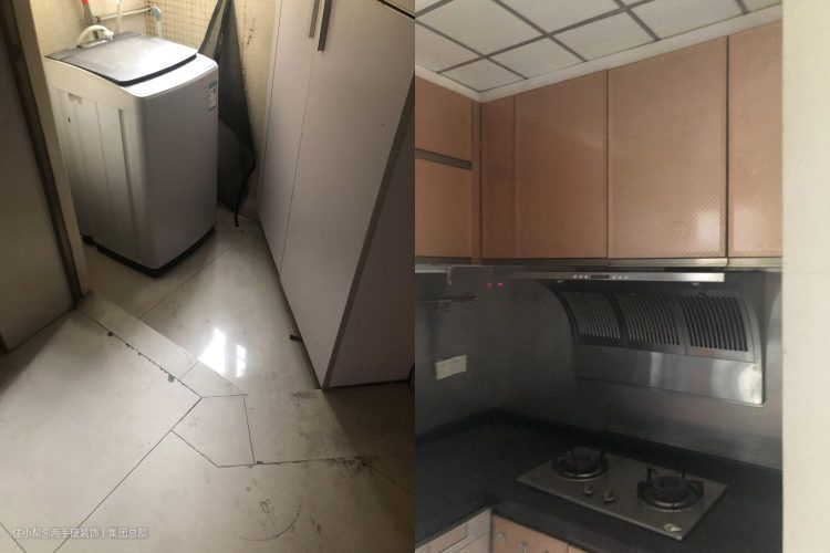 ▲改造前: 1,原来的洗衣机放在厨房的角落,拿取衣物晾晒非常不方便,地板也是东拼西凑,看起来不整齐美观。角落物品堆积在一起形成卫生死角,打扫起来也有一定难度。 2,原来的橱柜颜色相对暗淡,台面看起来油腻污浊,厨房动线不明显,抽烟机能效低,炒个菜便“硝烟弥漫”,男主人常常调侃道仿佛在打战。上方的吊柜对于女主人来说过高,放在吊柜最里面的东西踮起脚拿都略显困难。