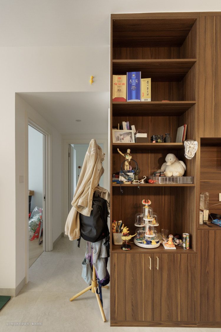 因为入户口比较狭长,安置了玄关后空间并不那么宽敞,所以在靠近餐边柜的空位上放置了一个简易实用的衣帽架,方便放置外套、包包、帽子等物品。