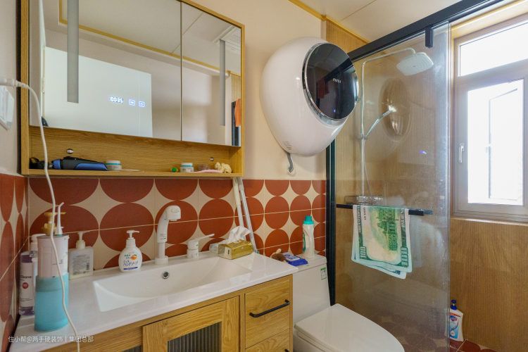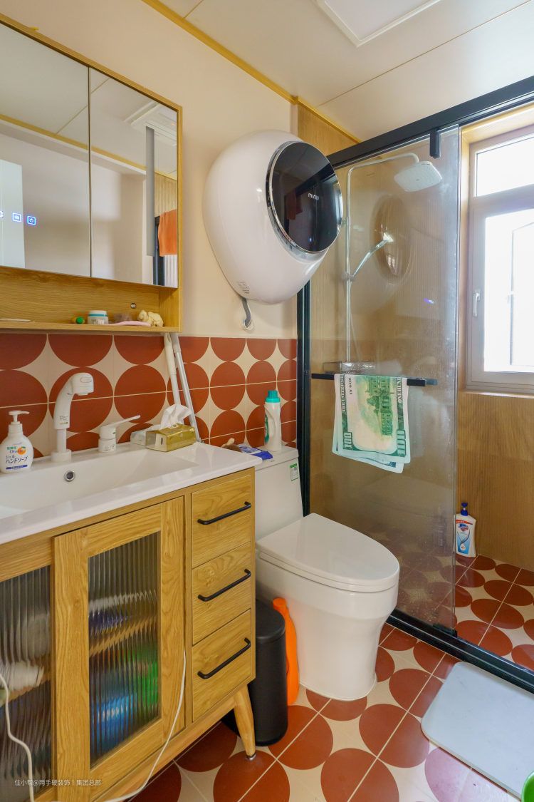 卫生间采用干湿分离的设计,淋浴间用玻璃门隔开,这样可以方便打扫也可防止滋生细菌。地板选择了防滑的圆形拼接的小方砖,为简约的浴室增添了一丝色彩。下方的柜子满足了吹风机、和洗脸巾、备用洗漱用品的收纳。