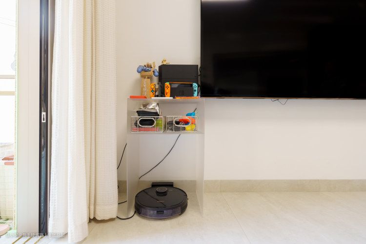 左边放置了一个简易的透明柜子方便收纳和拿取东西,下方放置扫地机器人,没有安置收纳柜打扫起来非常方便。