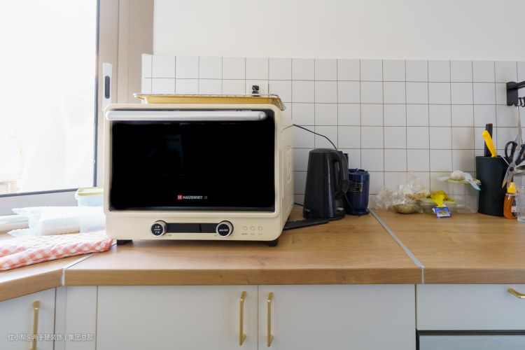 拐角处的台面正好可以放微波炉,为了整个厨房视觉上的适配度,业主特地选了白色。窗户就在燃气灶右边,下厨时打开窗户通风透气完全不用担心油烟问题。