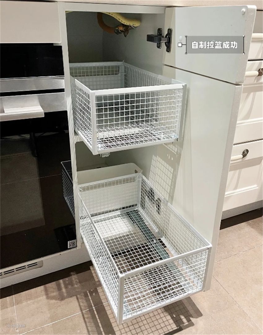 为此,定做橱柜时舍弃调味拉篮,用省下的钱买材料,自己做拉篮。