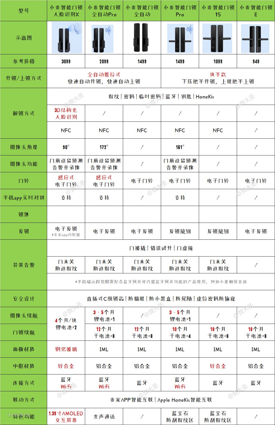 目前米家在售的智能门锁一共有六款,参数如下表所示↓