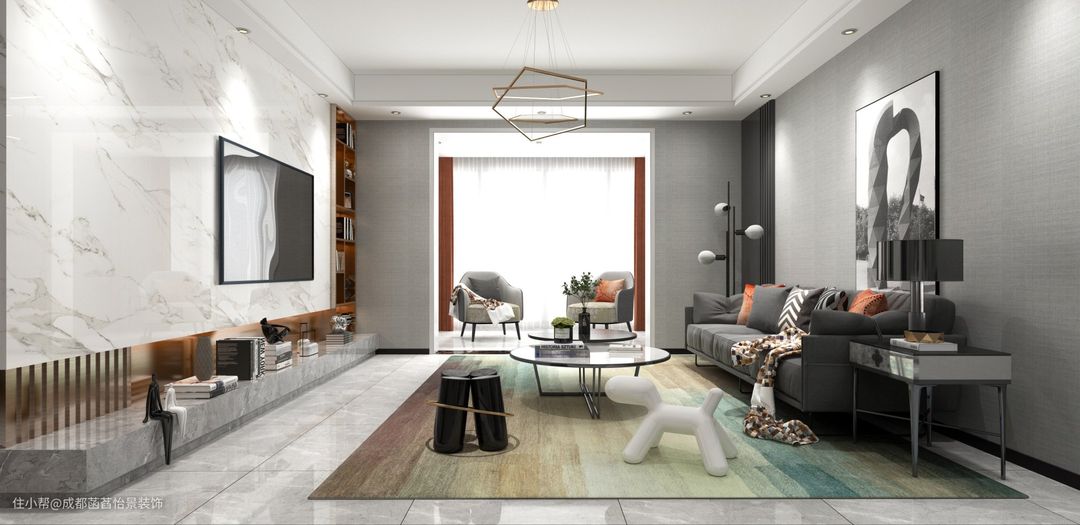 定制的电视背景墙,利用石材与收纳格的搭配设计,营造出一个多层次的空间。顶部的金属吊灯,简约而精致。