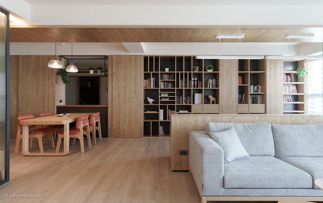 书架当然不是只能靠墙放置了,可以将大型书架搬至要分隔的区域,用书架替代隔断。不仅可以有效放大空间,还可以轻易划分出两个独立的空间。