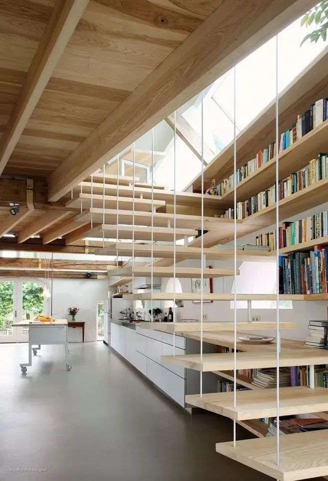 如果你家里有楼梯,那试试把书架做在楼梯的内侧呀。形式可以做不同大小方盒固定式,也可以做成落体式的,是不是有种图书馆的感觉了。