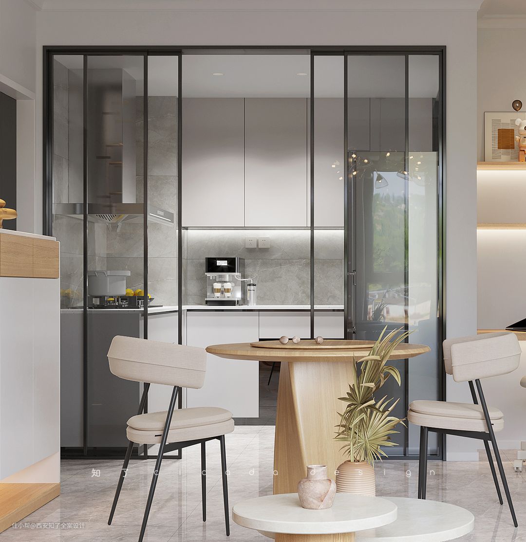 ②、增加空间互动,完全封闭的厨房模式容易时厨房显得逼仄狭小,玻璃推拉门可以保证主人在厨房时也可以顾及到外部的情况;