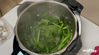 将适当的油和蒜末倒入锅中,便会自动旋转搅拌,然后把菜心和适当的盐放入锅中,盖上玻璃盖。
