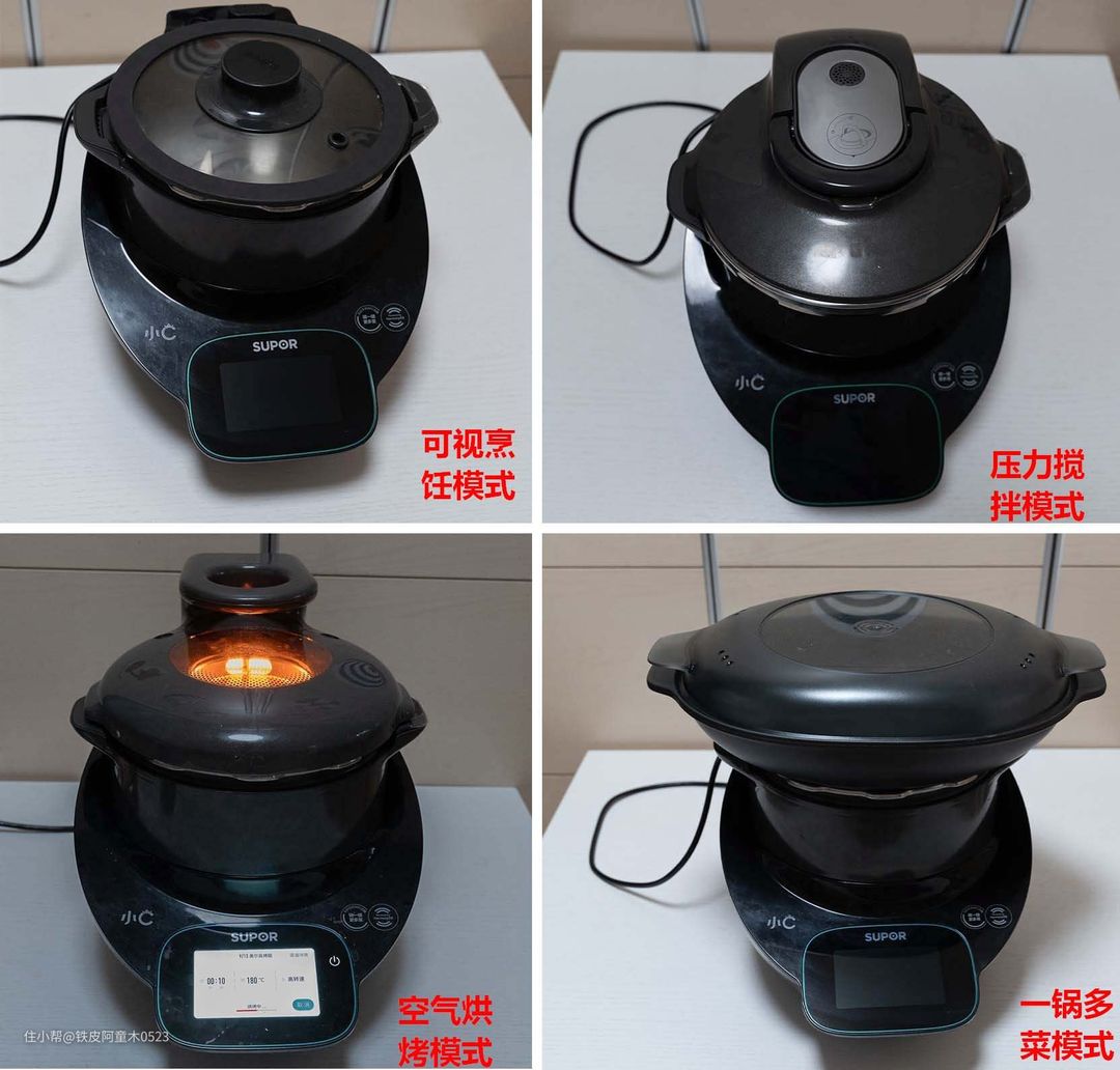 功能分化的十分细致:空气烧烤、红烧、炒/烩、焯水、收汁、搅拌粥、低温慢煮、压力蒸 、保温、慢炖、煲汤焖炖、清洗。