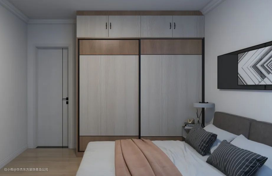 △ 卧室衣柜颜色为白色和原木色,采用推拉门设计,节省空间的同时,让空间更加和谐美观。