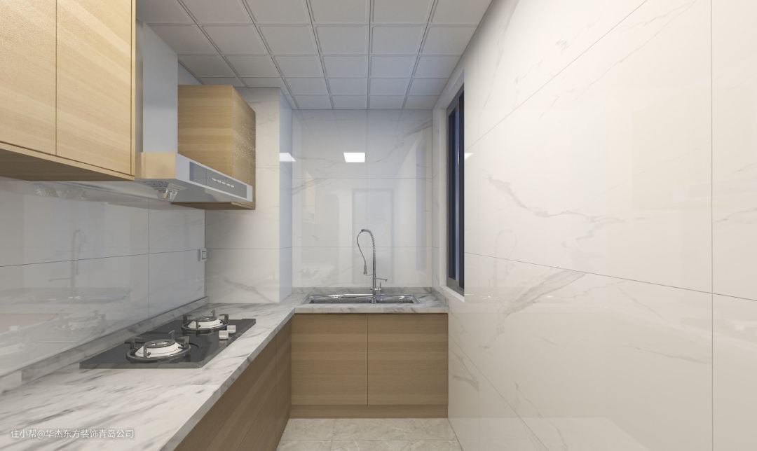△ 厨房台面为白色大理石,墙面为白色大理石纹路的瓷砖,空间整体性极强,让人眼前一亮。