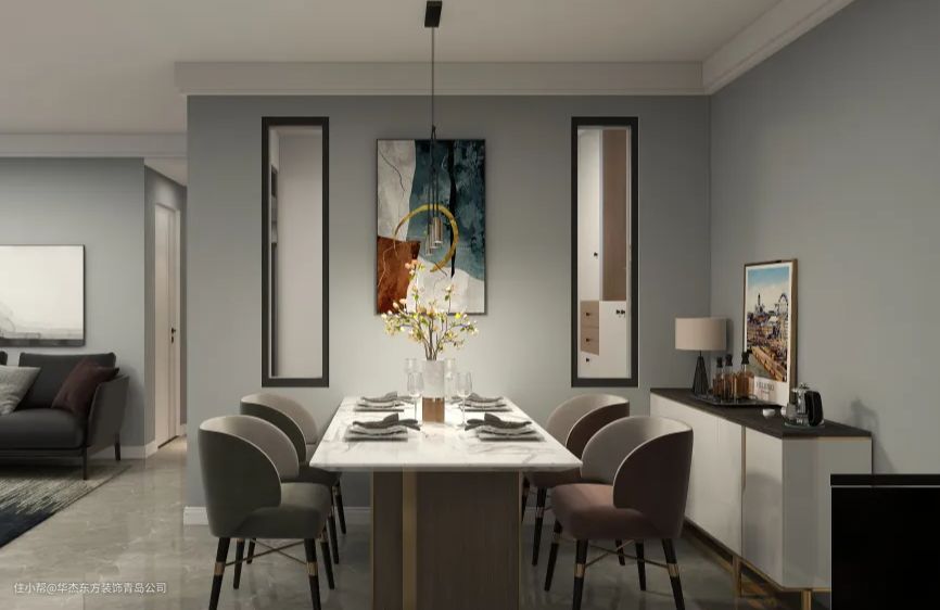 △ 餐桌一侧墙面上悬挂几何装饰画,令整体空间充满无限的张力,装饰画两侧悬挂矩形镜面,塑造了空间与视觉之间的丰富关系。
