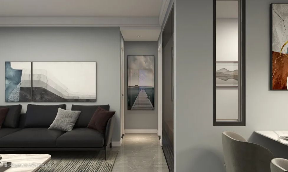 △ 玄关墙面使用了和客厅同样的灰色,整体空间尽显低调沉稳,一侧墙面挂有现代风格的装饰画,营造了玄关的现代设计风格的氛围。
