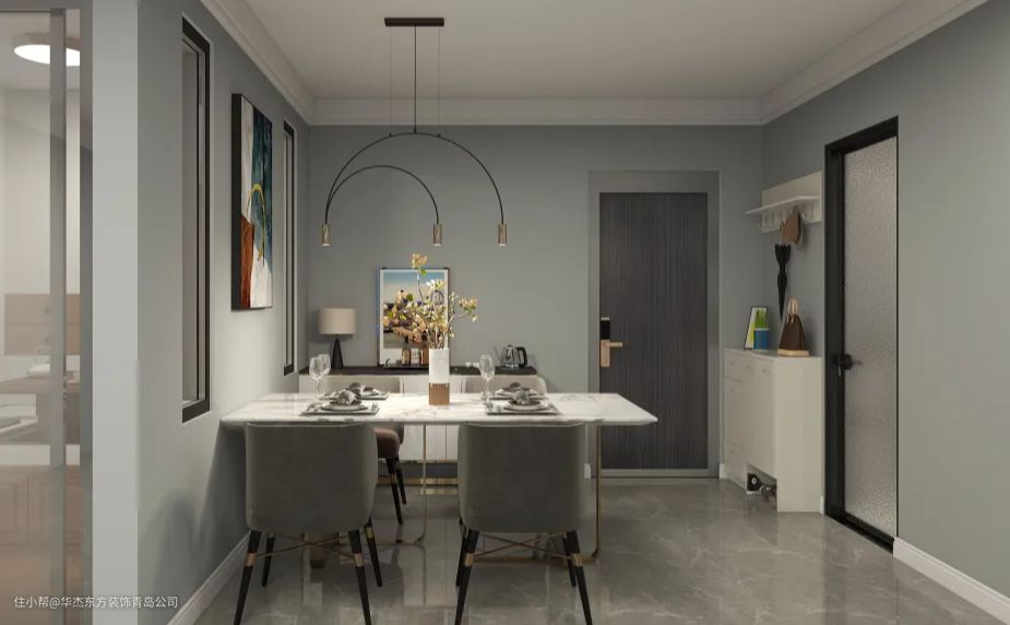 △ 客餐厅一体设计,没有设置单独的餐厅空间,摆放白色大理石纹理的桌面,搭配灰色系餐椅,沉稳又不失单调。