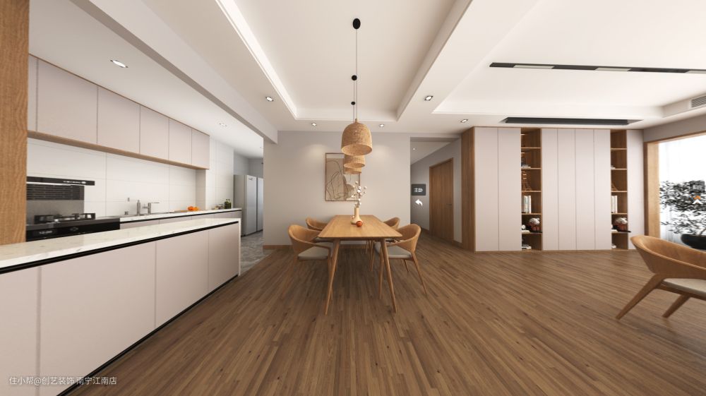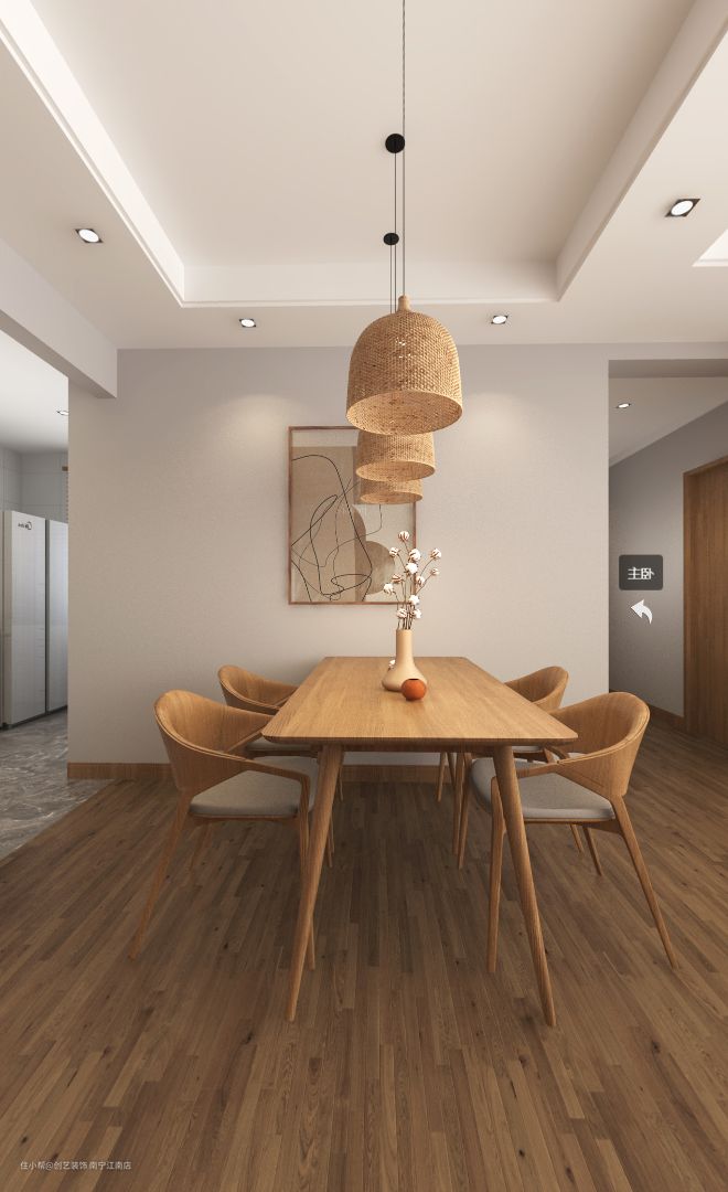 木质的餐厅地板,搭配一整套木质餐桌椅,墙上的极简挂画以及吊灯的装饰,营造出餐厅清透禅意的意境。