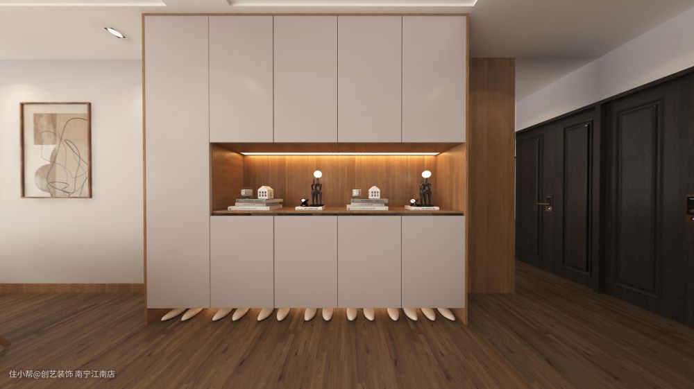 入户门旁到顶的柜子既美观又可以收纳,中部镂空的设计实用性大大提高,让业主进门顺手放些钥匙小物品等,感应灯的装饰,业主一进屋就有迎接自己的那一抹光亮,非常暖心~