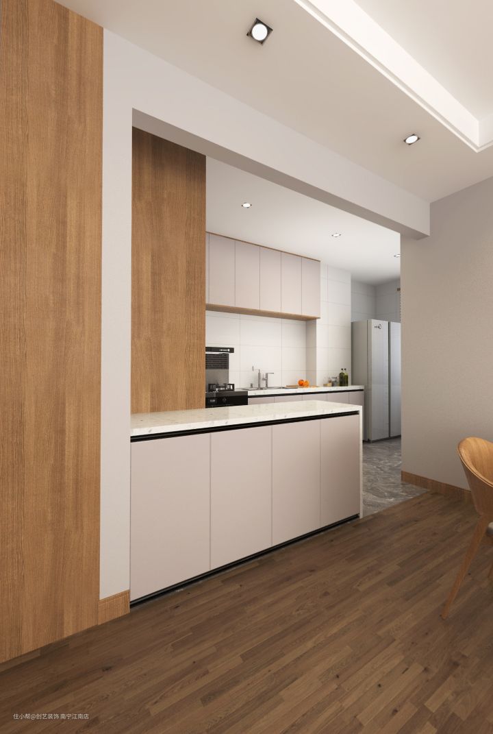 厨房是半开放式的设计,空间通透,在视觉上显得更加的宽阔。