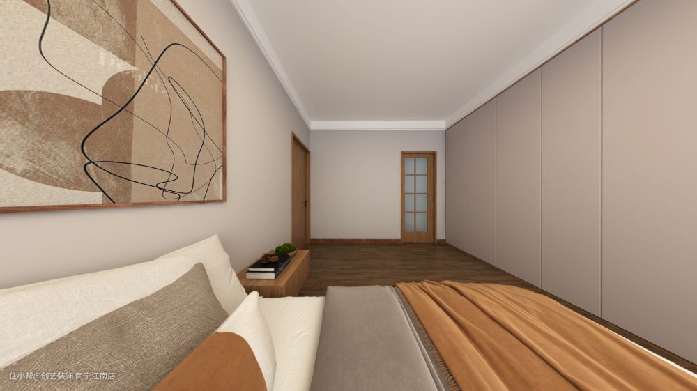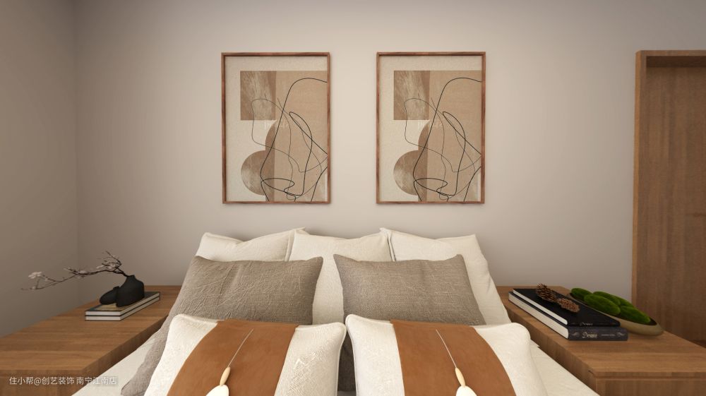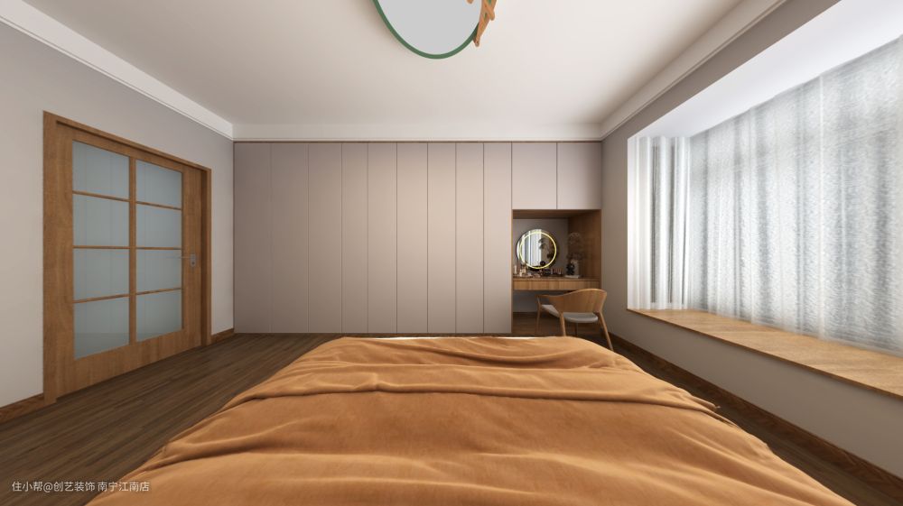 卧室简简单单木色设计,素净自然,淡雅而不单调。大面积原色木材延伸空间,通顶的大衣柜,让一些杂物有处安放,打开窗帘,阳光晒进来,清爽舒服。