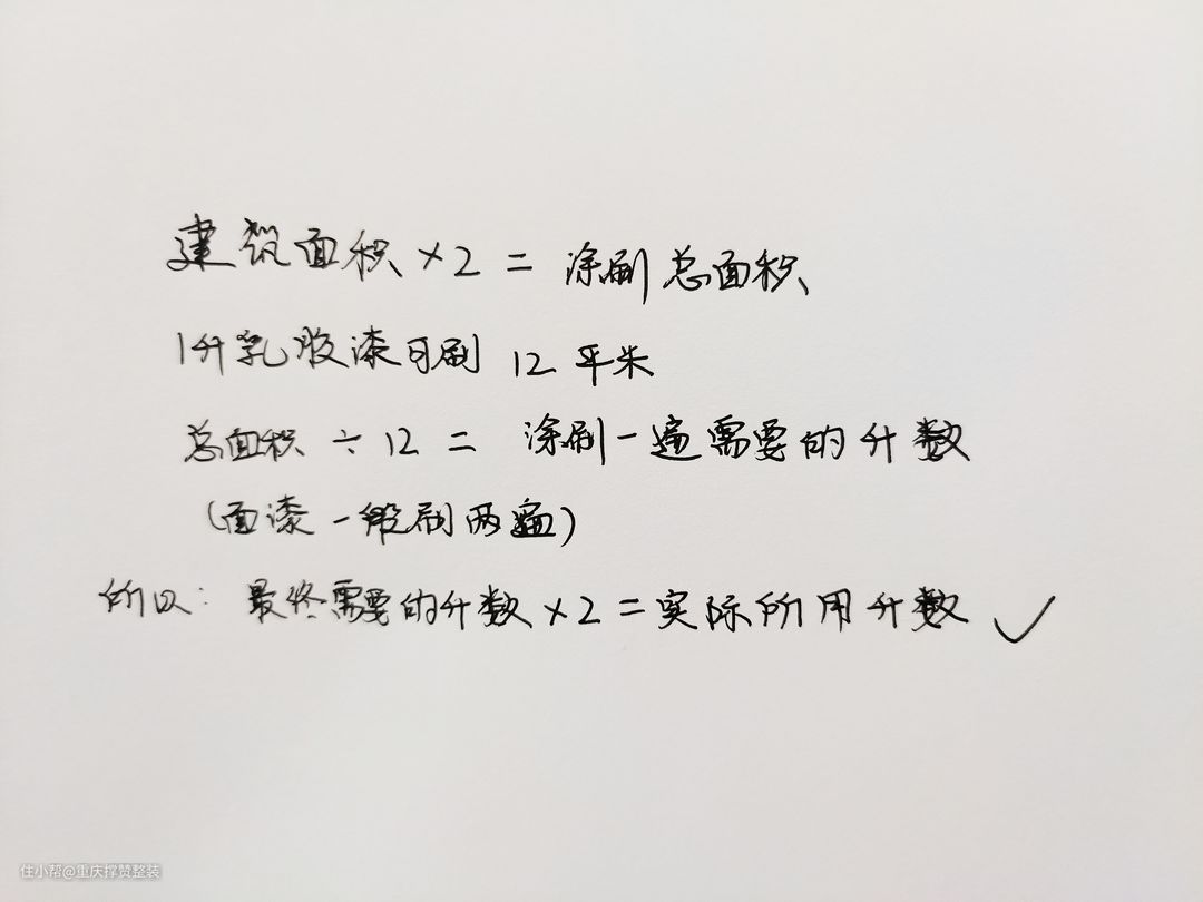 记住这个公式:建筑面积*2,就是你家需要涂刷的总面积,1升乳胶漆可以涂刷12个平方米,总面积除以12就是刷一遍乳胶漆需要的升数,正常我们要刷两遍面漆,那就乘2即可(看图)。