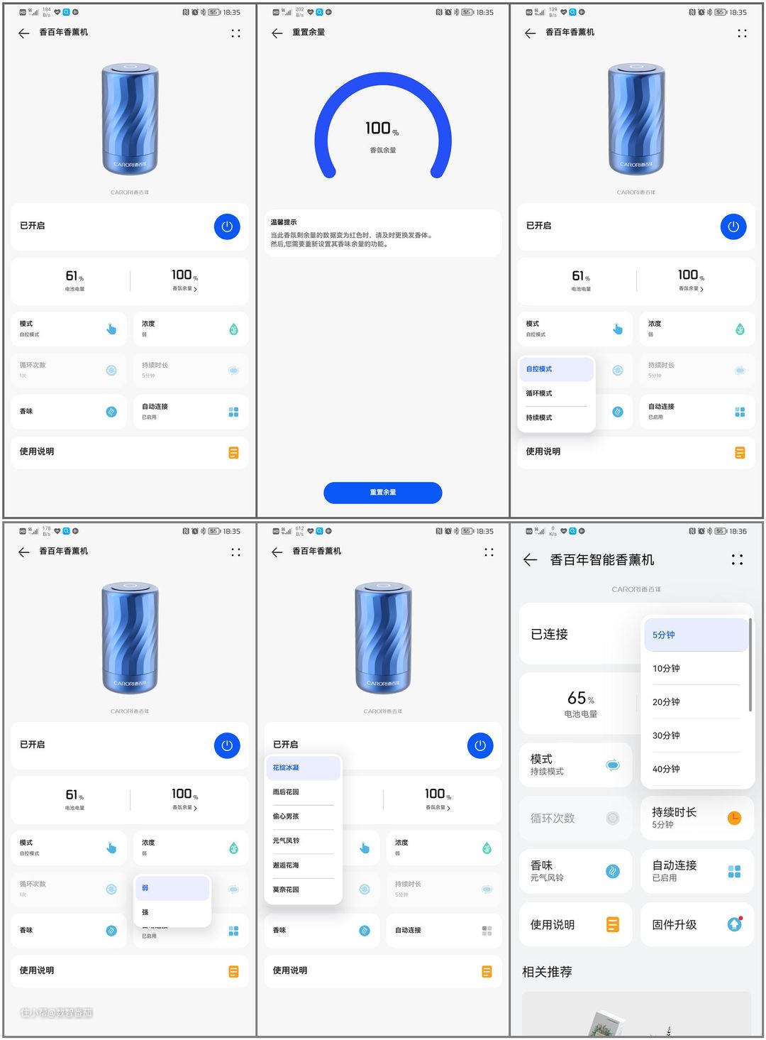 对比一些蒸汽香薰、火蒸香薰,香百年香薰机实现无火、无水分的一种微加热来散发香味的体验方式,同时配合华为鸿蒙智联的智能操控,在操作方面又带来了一种全新高效的使用效果,还支持远程操作香薰机,无论是家用、、休闲养生、工作办公场所还是行车车载使用,都是一个很好的选择。