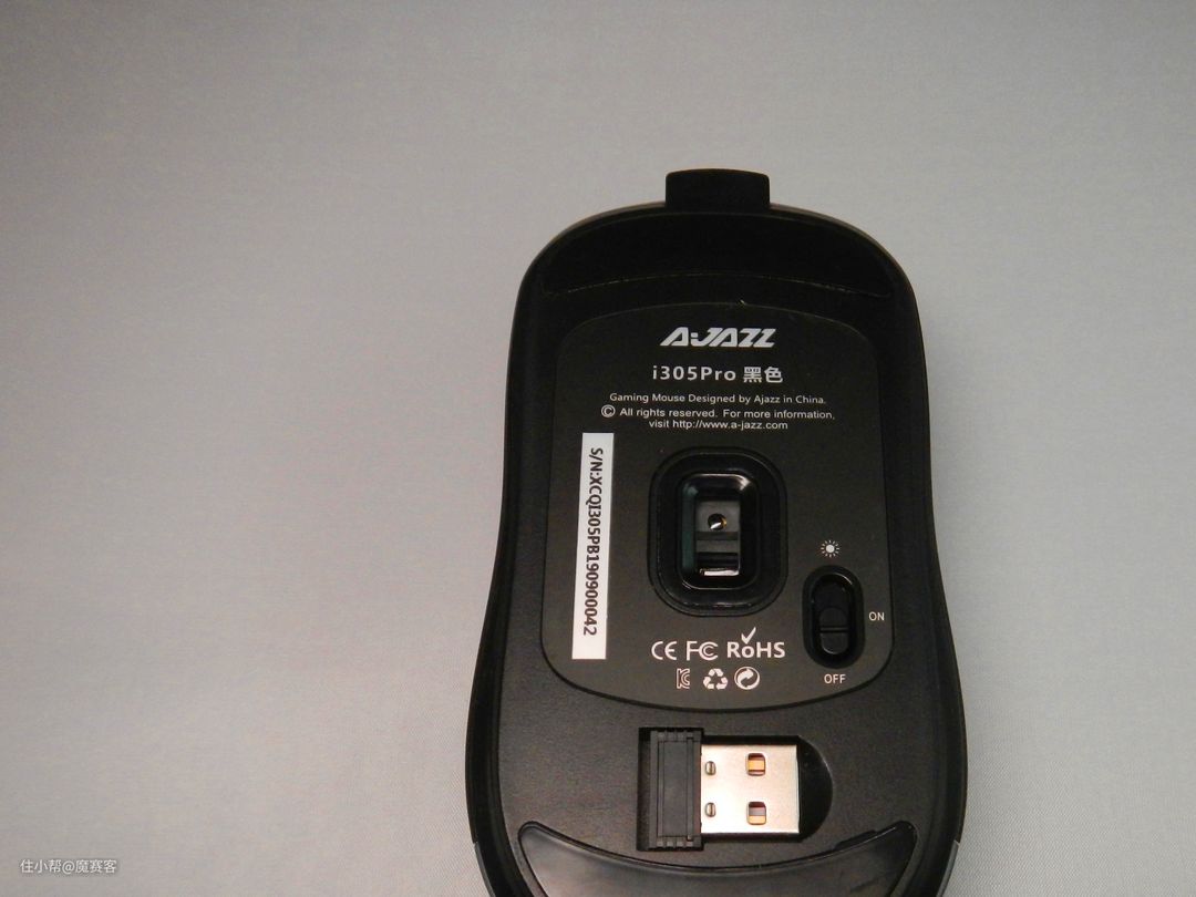 ▲底部的下方是接收器收纳处,右方是开关。开关分了三档,从上到下分别是灯光效果开、鼠标开、鼠标关,如果在办公室使用则可以选择灯光关闭,这样就不太招摇。这款I305PRO采用的是光学引擎,传感器为PAW3338。