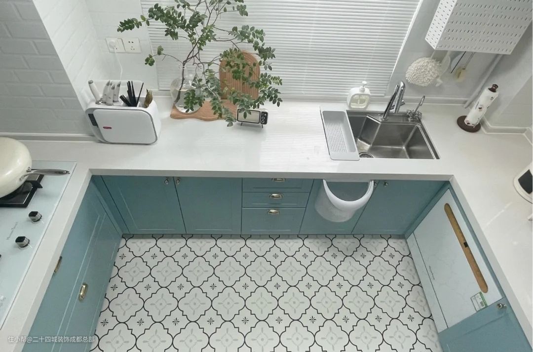 厨房尺寸:1.79x3.15米U型厨房,厨房设计理念:我家厨房是比较清新的蓝绿色,主打清爽,所以烟机灶具我也选了白色来搭配,墙砖用的300x600的亮面凹凸白色瓷砖,不单调,入住大半年来,几乎没打理过也不脏。