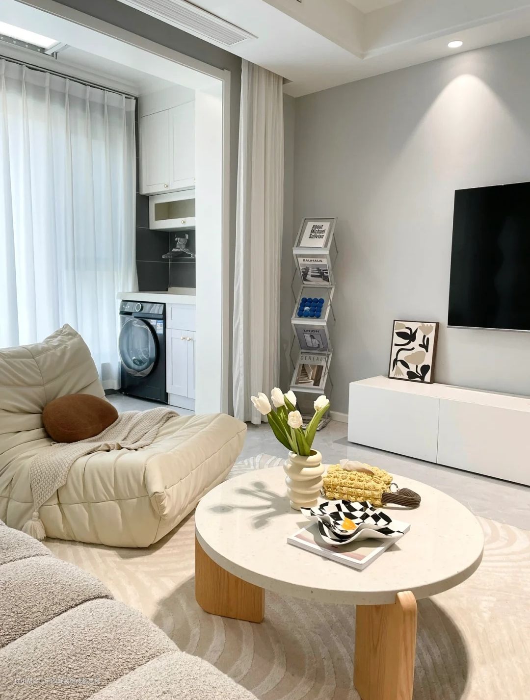 我家没有做电视背景墙,客餐厅统一刷的浅灰色太空漫步乳胶漆,省钱又耐看,色调统一会显得空间更大,越简单硬装越是包容性强,充满无限可能,后期想换风格只需要换换软装即可~低成本换新房的快乐只有我们懂。
