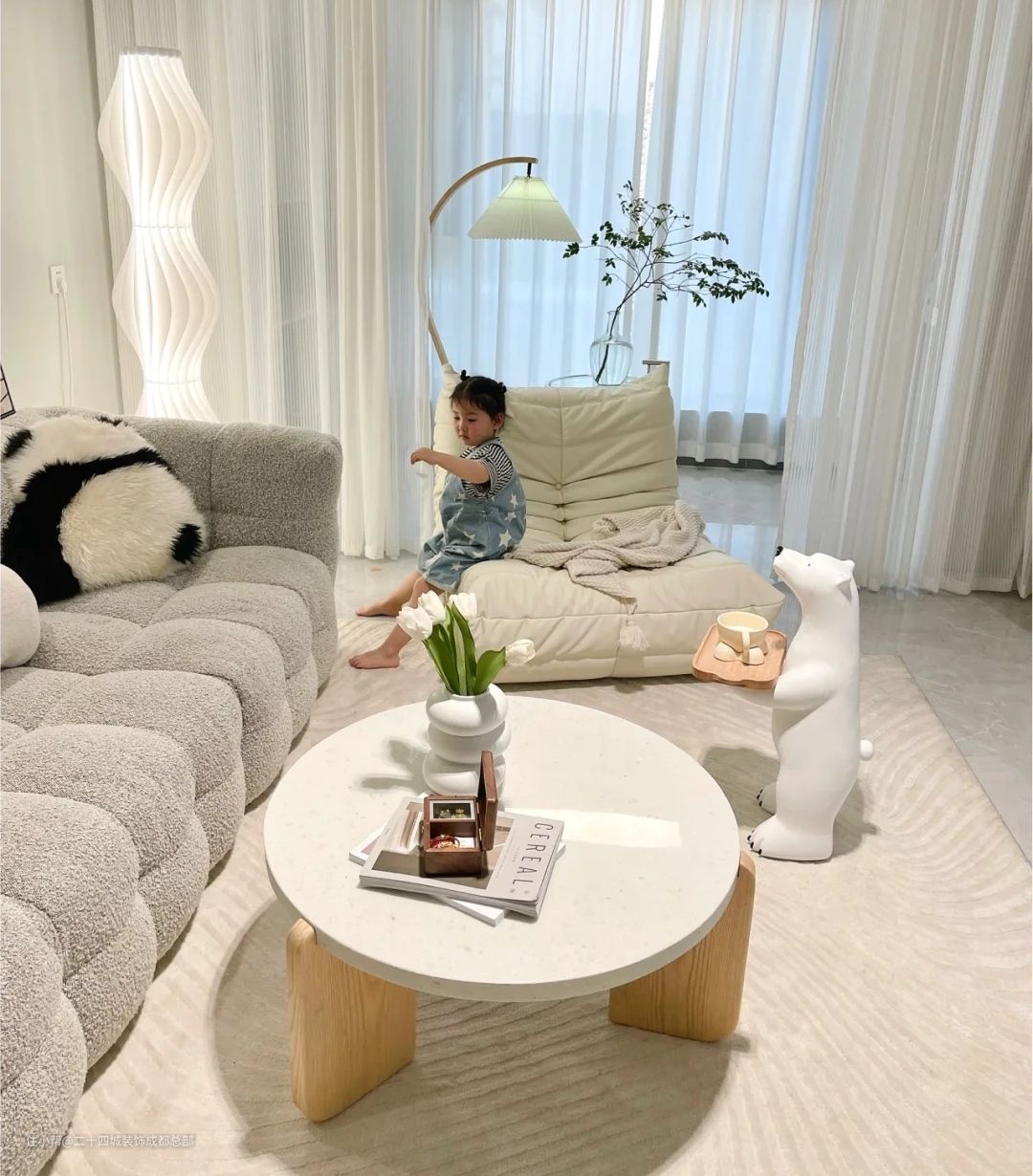 一旁搭配毛毛虫沙发,让空间更加休闲,多条褶皱构成的慵懒光是看到就让人非常放松。