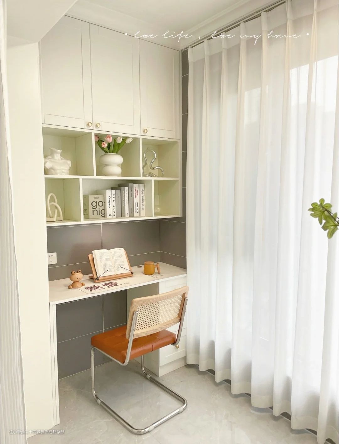 因为没有书房,在阳台左侧做了一个书桌,上面是书籍收纳,也可以放一些摆件增加美观度,下面是桌子➕抽屉,可以收纳一些证件文具,平时工作学习,就在这里搞定了。