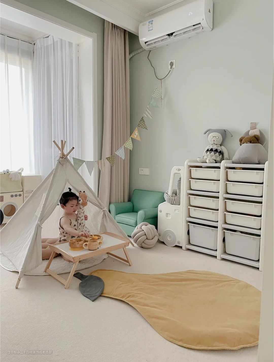 千万不要把儿童房一步做到位,轻装修重装饰,让儿童房和宝宝一起成长才是明智之选,地面通铺的地砖,全铺了一张大地毯,立马温馨起来~小汽车收纳柜,收纳功能强大造型又好看,关键价格也超级合适。
